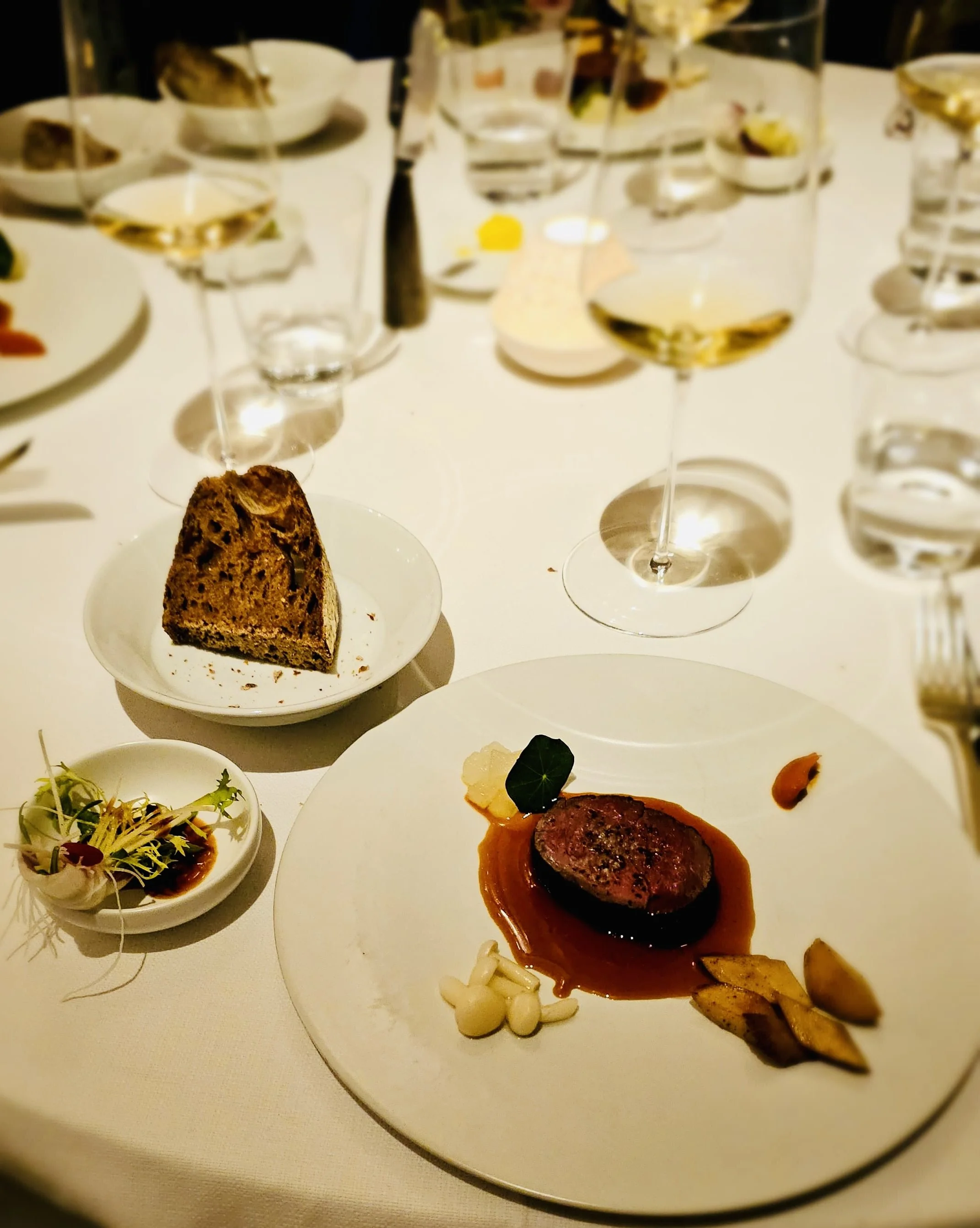 The wines? An entire story in themselves. The sommelier with a quiet smile and thoughtful manner asked gently for a budget, and then disappeared. He returned with bottles that not only respected it, but transcended it. My guests never knew. Discretion was the art, and generosity the result: a Saint-Joseph 2023 from Domaine Gangloff that hummed alongside the fish, and a 2021 Magis Châteauneuf-du-Pape that held its own next to the beef. Even the farewell sip of a dark, rounded Pineau François 1er was presented with the same quiet respect for ritual.
