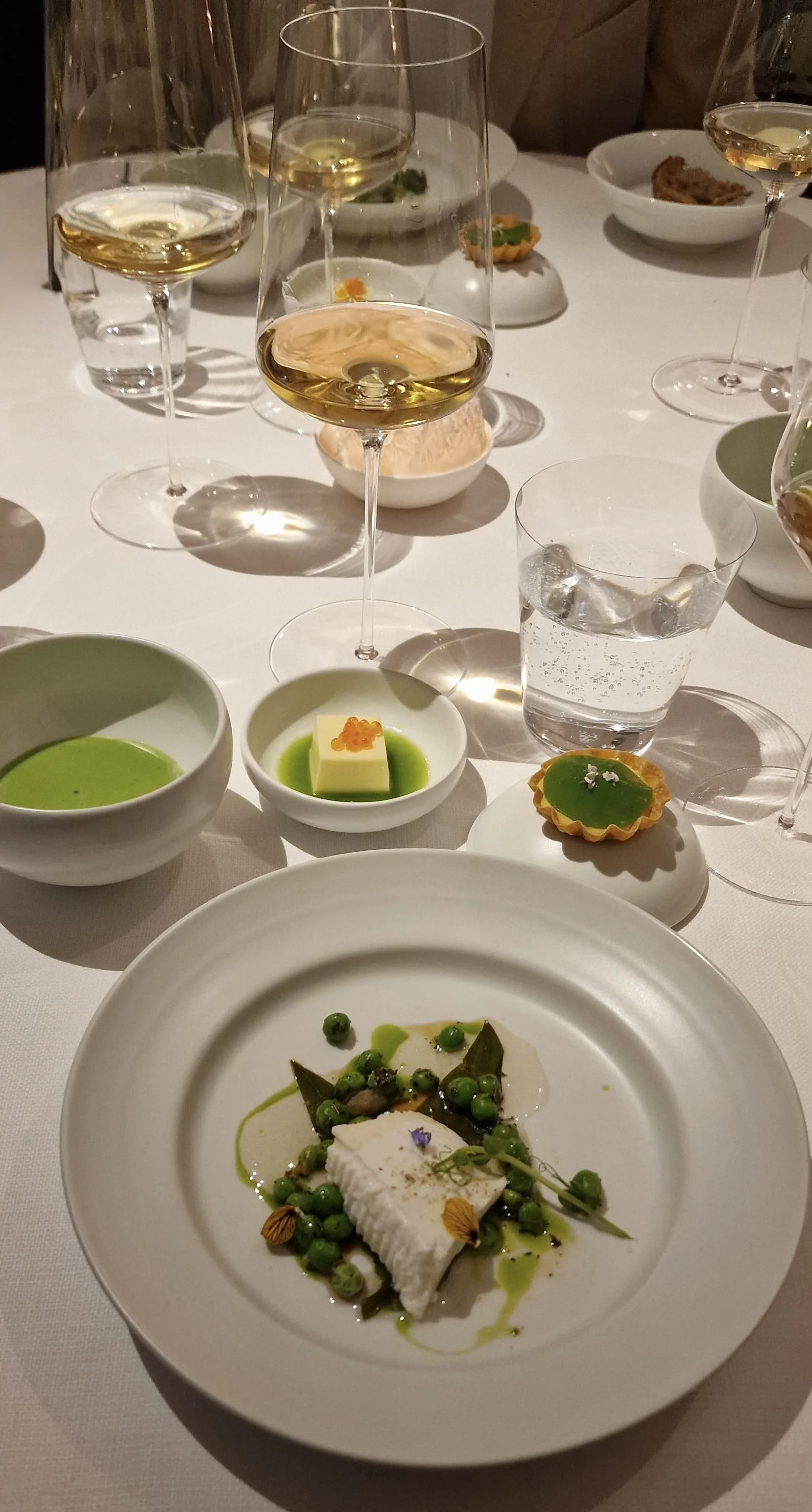 It began with a whisper — petits pois and Centogiorni from the Vesuvian slopes, in conversation with brocciu from Mireille Mameli, and a mint note so delicate it might’ve been a breeze. It was springtime, in spoonfuls. A silky Sole followed, paired with white asparagus and Osciètre caviar, in a Chardonnay sauce so refined it seemed to vanish before it arrived.