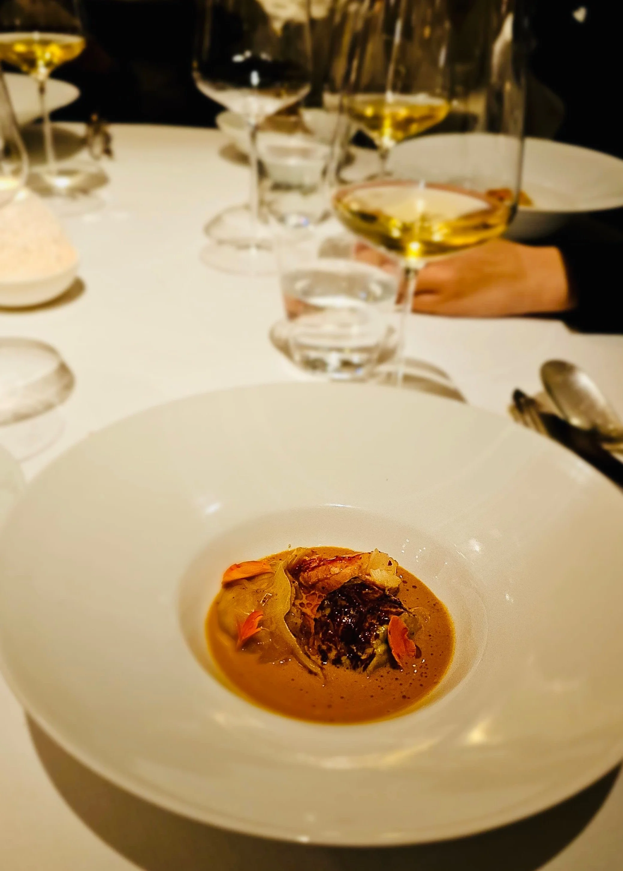 But the moment I’ll carry? The Breton blue lobster. Poached in butter, its tail nestled beside delicate gyoza filled with a silky lobster mousse. Deep in flavor, but never overpowering. The same richness returned in a sauce touched with kimchi, bringing just enough warmth to lift the whole plate. It was both clever and comforting, like someone told a childhood story in another language, and you still understood every word.